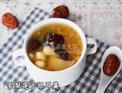 材料:干銀耳 半朵,梨 1個,紅棗 適量,蓮子 適量,冰糖 適量