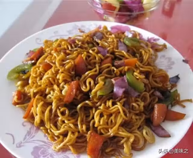 方便麵每人一袋、火腿腸1根、胡蘿蔔半根、青椒半個、紫甘藍1片、醬油適量、陳醋適量。