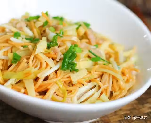 7、將炒好的韭黃冬筍絲肉絲倒入,調入少許鹽糖調味,剪入蔥花大火炒勻即可。