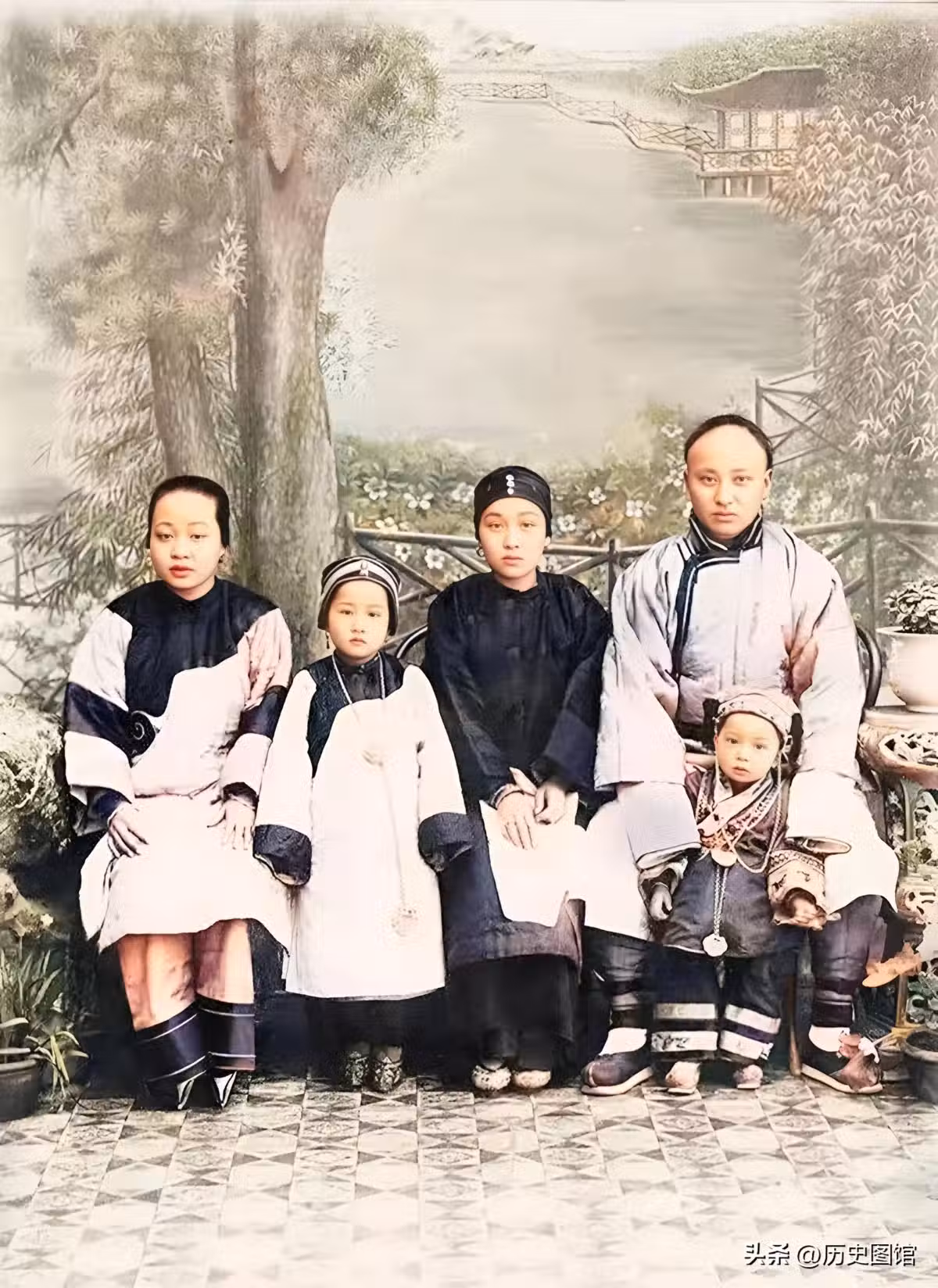 這是一個五口之家,幾個人來到照相館裡拍全家福。男子很年輕,身旁坐著的是他的妻子。最右邊坐著的是男子的小妾。她眼神迷離,沒有看向鏡頭。
