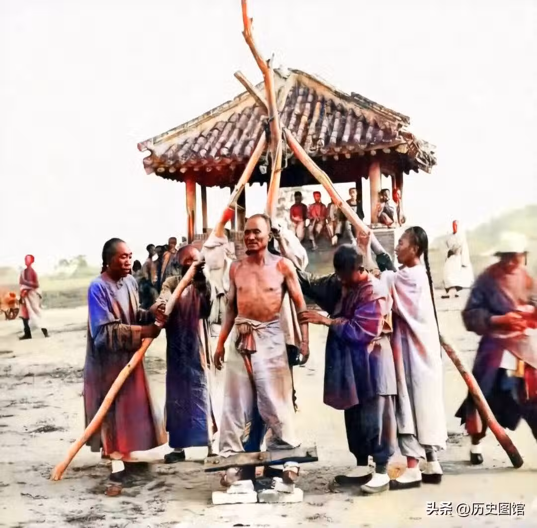 在郊外的一處空地上,幾名男子用木棍搭起來一個架子。將一名光著上身的男子綁在架子上。男子的腳上,還戴著沉重的木枷。一名衙役快步從旁邊經過。
