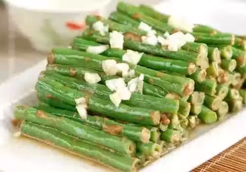6、將豇豆放入醬汁中,加入蒜碎,拌勻。