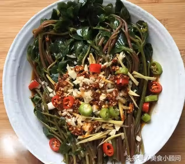 1.準備食材:馬齒莧、香油、鹽、生抽、大蒜、剁辣椒