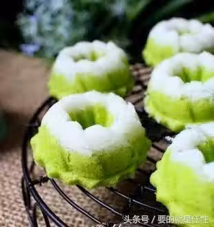 1)杯子塗上少許的油。把嫩椰絲放入杯子裡壓緊。