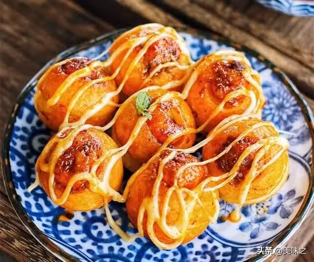 12、直到兩面都熟透定型了,從丸子盤中取出裝盤,擠上隔水融化的芝士糊即可。