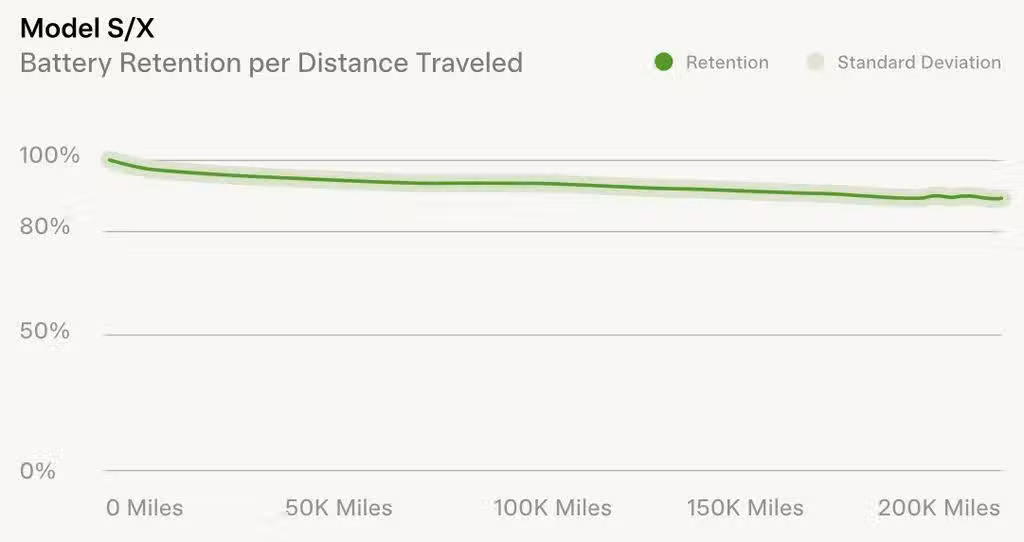 在特斯拉官方發布的《2020 影響力報告》中提到,Model S/X 在行駛 20 萬英里,也就是 32.2 萬公里後的衰減是 12%。