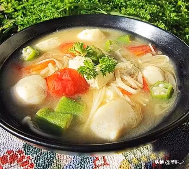魚丸200g、金針菇300g、味噌湯醬150g、番茄1個、豆腐適量、蔥花適量、香菜適量、秋葵適量。