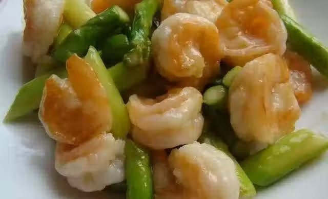 5、把蝦仁放入油鍋滑炒至變色,放入蘆筍一起煸炒片刻,加少許鹽調味出鍋。