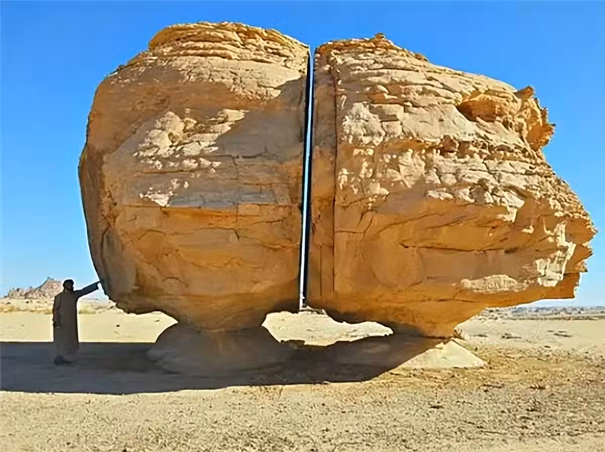 巨石的底部,有兩個基座支撐著這兩塊分離的石塊,宛如它們生來就是如此,一直隱藏在地底深處,等待著被揭開的一天。這種結構之精密,令人難以置信,對於那個年代的人類來說,這幾乎是不可能完成的任務。