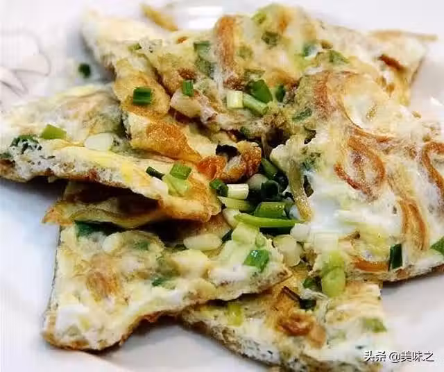 5、把蛋液煎至底部定型後,撒入香蔥末少許,然後翻勺稍煎即可。