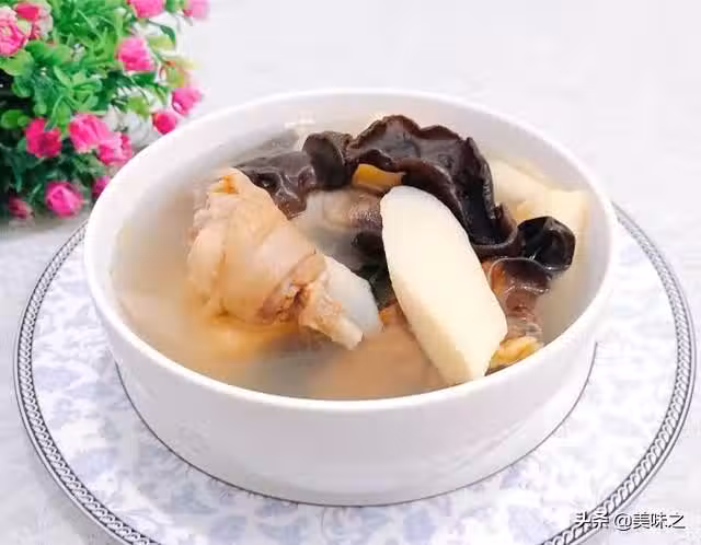 6、把茭白,放入雞湯中,把木耳,也放進去,加入鹽。