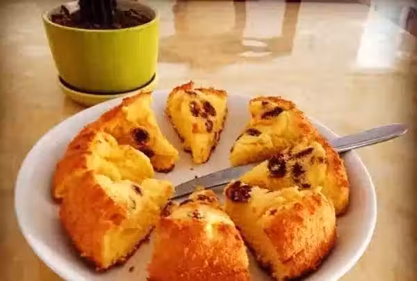 食材:麵粉80g、雞蛋4個、葡萄乾30g、色拉油適量、鹽適量、牛奶8勺酵母5g、白糖50g做法:
