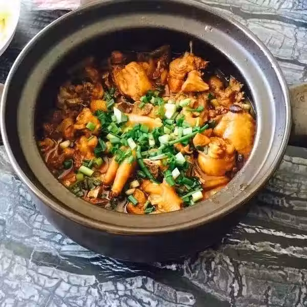 5.將醃料倒入砂鍋(醃制用的小蔥不要),加入適量的水和剩餘的半袋料酒,大概剛好滿過雞肉的位置就可以了。淋入兩勺大豆油,