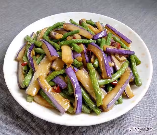 紫皮茄子1個、豆角250克、姜2片、蒜2瓣、干辣椒4個、鹽2克、雞精2克、生抽1勺、蚝油1勺。