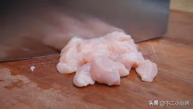 1、首先準備一塊雞胸肉,把雞胸肉從中間分開,一分為二,再把雞胸肉切成長一點的條,寬度大約在1.5厘米左右,再把長條切成小一點的塊,小一點的塊比較容易入味,也比較容易成熟,切好之後給它裝入到碗中,方便下一步操作。