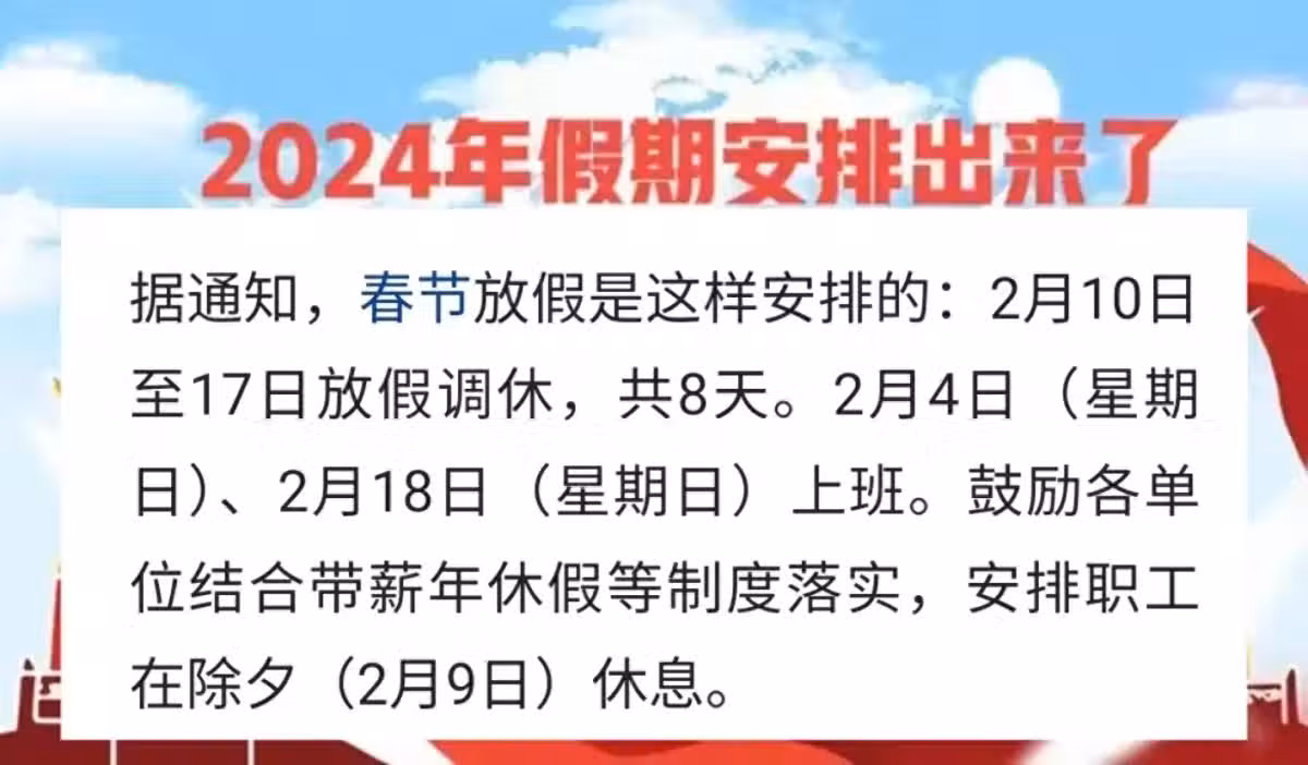 除夕不放假了,但把除夕放假的權力交給了單位,鼓勵各單位結合帶薪年休假制度落實,安排職工在除夕(2月9日)休息。希望單位別辜負了員工的願望,畢竟,除夕夜要趕著回家和家人團聚。