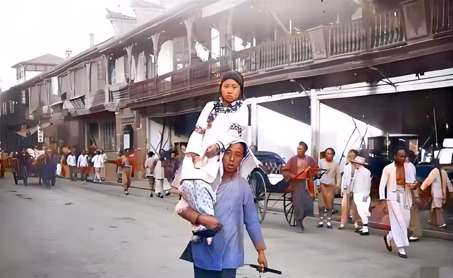 為了生活,有些女孩子不得已墜入青樓。他們依靠出賣自己的青春過活。照片中這名十四五歲的女孩,坐在一名男子的肩膀上,前往一處青樓。