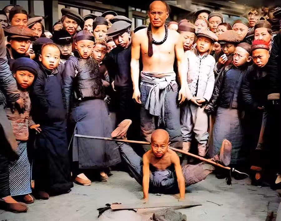 照片中這名男子,身材魁梧,他正帶著自己的徒弟,在街上表演雜技。精彩得表演,吸引了一大群人圍觀。這個小孩子吃了不少苦,才練出如此身手。