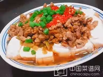 嫩豆腐1盒、豬肉餡100克、尖椒2個、料酒、鹽、蒸魚豉油3勺、香油3勺、花椒、蔥。