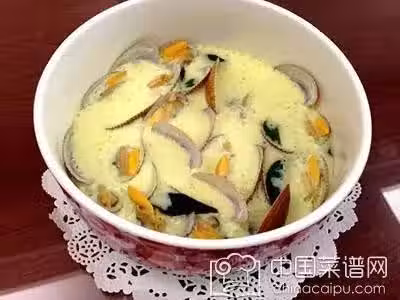 3、盤子抹油,放入煮開的白蛤,倒入過篩的蛋液。