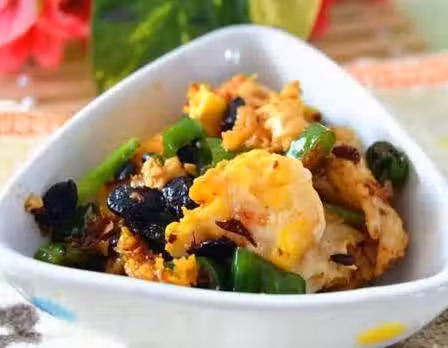 食材:雞蛋3個、油適量、鹽適量、豆豉適量、線椒2個、生抽適量、香菜適量。