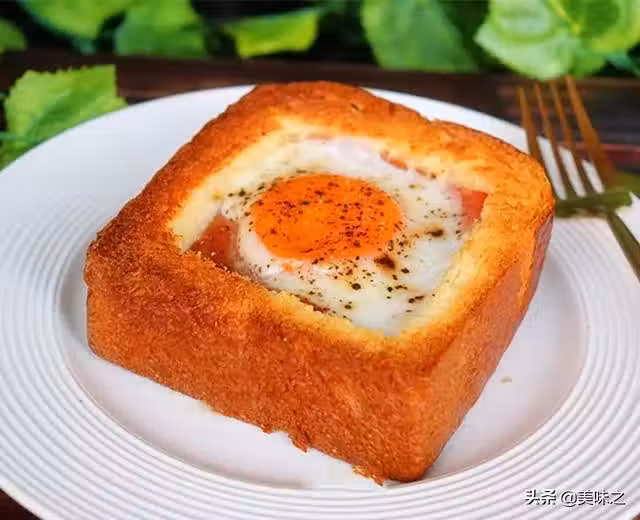 12、放涼的吐司切厚片,用刀叉在吐司中間挖一個火腿片大小的方塊,然後放入芝士、火腿片、再倒入雞蛋,表面撒些胡椒粉。