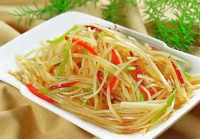 4.用清水將切好的土豆絲泡去澱粉,(這樣炒出的土豆絲清爽不粘)。