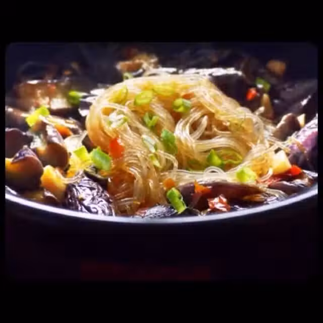 另起一個小砂鍋把粉絲鋪在底層把茄子連同湯汁一起倒入砂鍋加一勺蝦醬小火讓汁把粉絲浸透最後撒上蔥花就好了