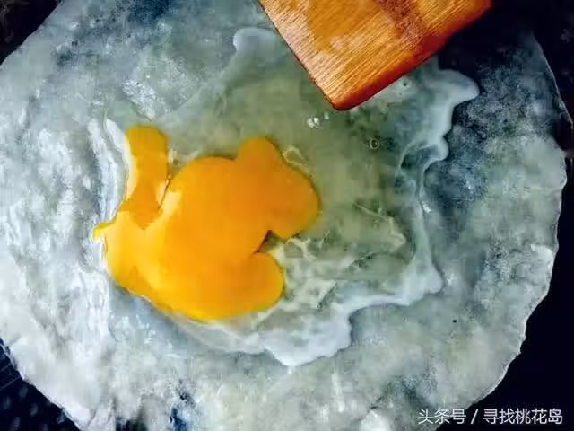 小提示:不要先預熱鍋,要把麵糊倒入冷的鍋中,不然麵糊一遇熱就凝固,成了一坨就沒法均勻攤開了。等麵餅底部凝固後,再翻面打上雞蛋,如果底部沒凝固就翻面,很容易散架,而且吃生面會拉肚子。