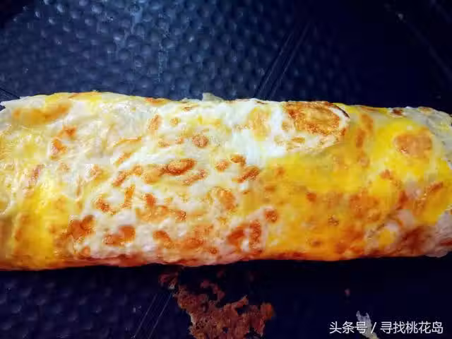 6. 待底部雞蛋完全凝固,出現少許焦痕(有焦痕比較香),把整個餅緊緊捲起來,從中間切開吃,或者裝入口袋裡,拿著整條吃都可以。小提示:最好現做現吃,口味最好。如果涼了,也可以放入微波爐中火轉幾十秒就可以。