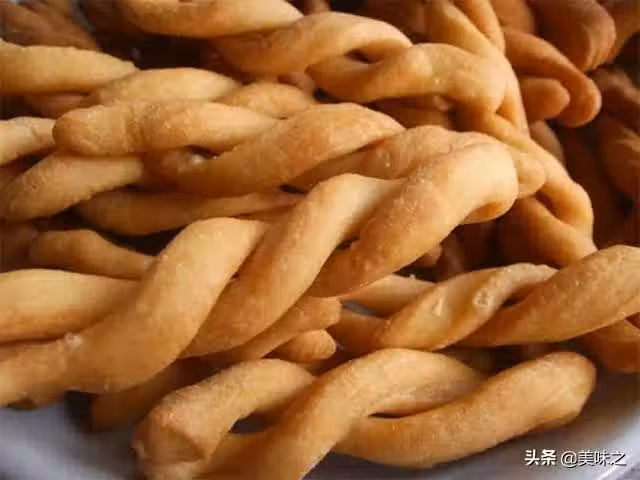 5、然後切成半厘米寬的長條。把切好的長條稍稍搓細搓圓,然後對摺,左右手各拿著麵條的兩端,然後朝反方向擰幾下,即成麻花坯。