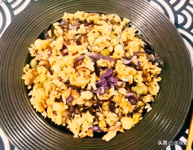 胡蘿蔔6片、紫甘藍1塊、玉米粒8g、青豆8g、米飯1碗、雞蛋2個、蒜1瓣、鹽1匙、白鬍椒粉1/3匙、植物油1勺、醬油1/2勺。