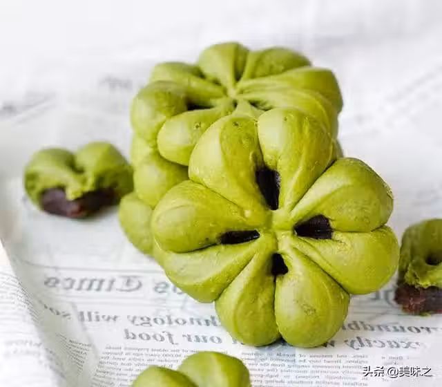 高粉250克、抹茶粉15克、細砂糖50克、鹽3克、全蛋液50克、牛奶205克、酵母3克、黃油35克、豆沙餡360克。