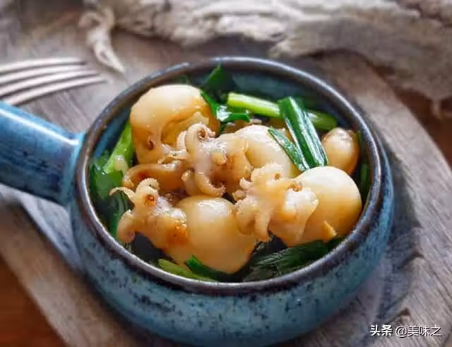4、加入墨魚仔、蚝油、料酒。