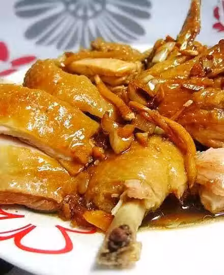 5、加入蒜米和薑絲,再燜煮2分鐘,把雞肉斬塊,鍋內醬汁倒在雞肉上即可。
