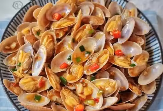 (5)再放入花甲翻炒斷生,倒入調好的料汁,大火翻炒均勻,至食材熟透入味,大火收汁,關火出鍋,最後撒上蔥花點綴即可。