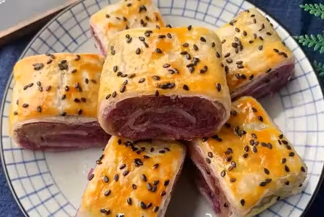 (2)取一張手抓餅,鋪上一層蒸好的紫薯泥,捲起來壓實切成小段。