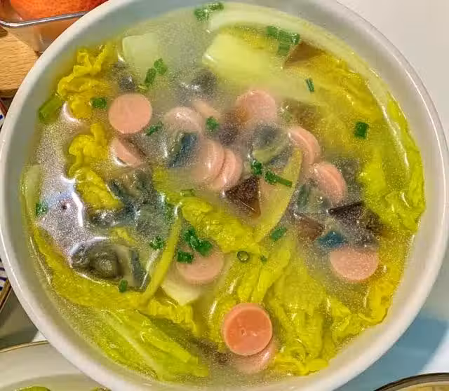(1)娃娃菜洗凈切段,火腿腸切片,皮蛋切碎,小蔥切蔥花,生薑去皮切片備用。