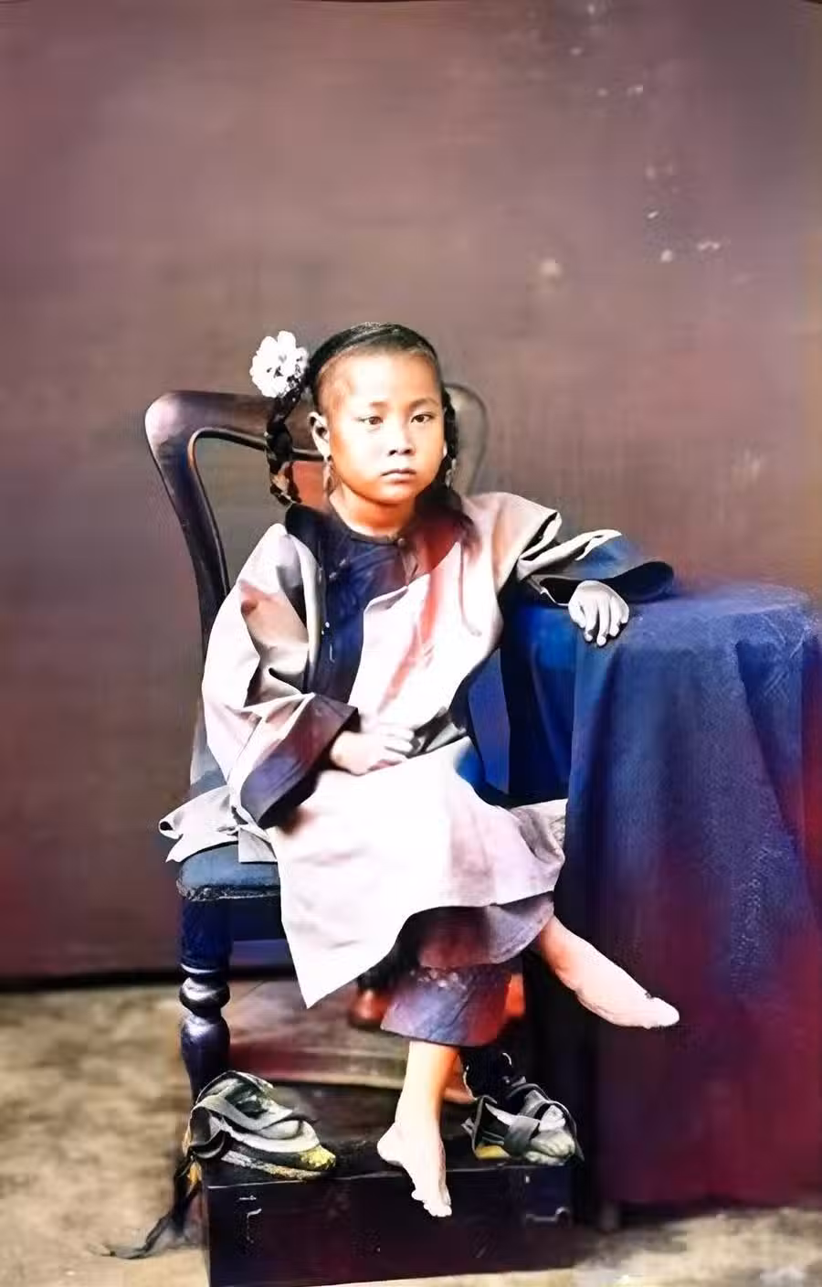這也是一位富家千金,身上穿著華麗,頭上戴著花。根據攝影師的要求,她脫掉了自己的鞋子。小小年紀,就已經開始了裹腳,看了讓人心憐。