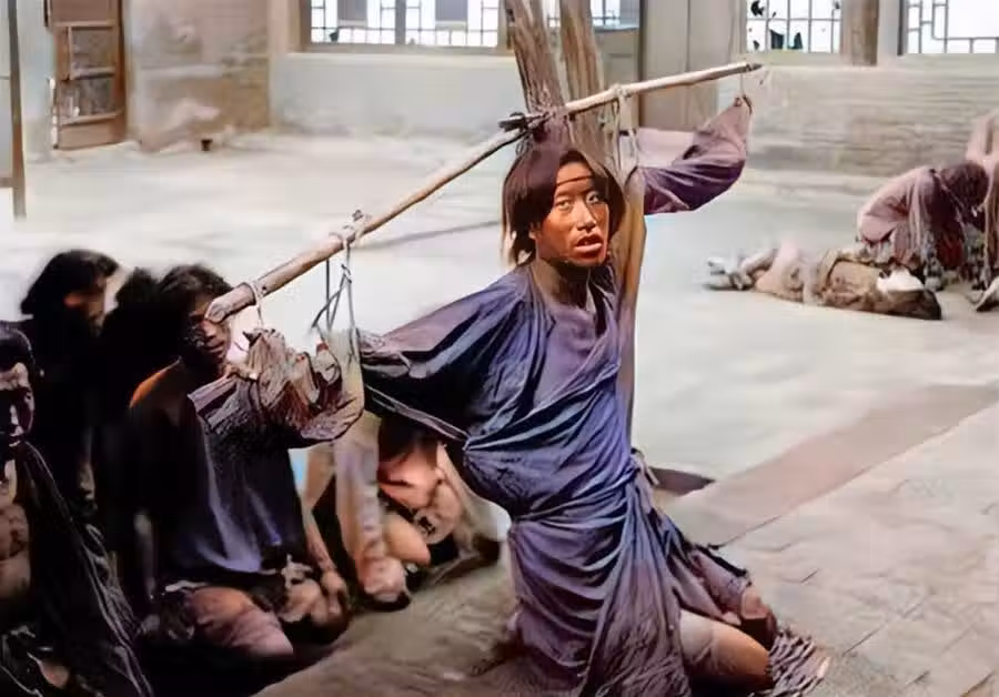 在衙門前的院子裡,一名男子跪在地上,兩只胳膊被伸直吊起。不知道他犯了什麼罪,眼神中流露著無奈。