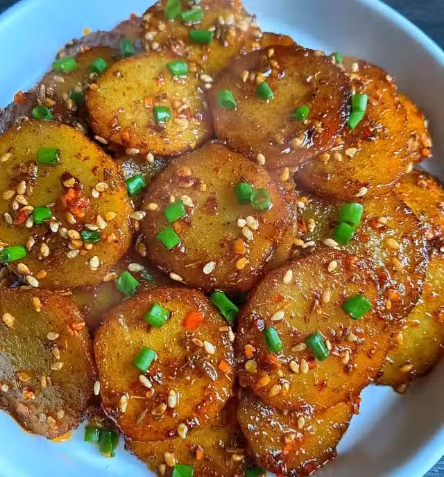 (2)鍋中倒入適量的油,油熱後下入土豆片,小火煎至兩面金黃色。