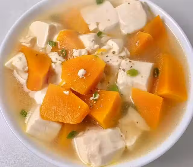 (2)鍋中倒入適量清水煮沸,下入嫩豆腐和南瓜塊,焯水片刻撈出瀝干水分備用。