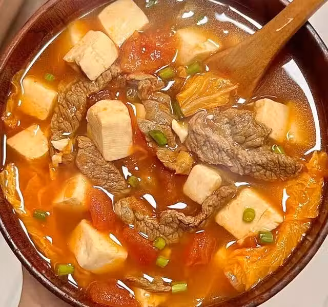(1)西紅柿洗凈去皮切塊,牛裡脊洗凈切條,白菜洗凈切段,豆腐沖洗一下切塊,香蔥切蔥花備用。