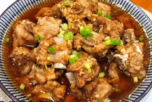 (2)腌制排骨‬:排骨‬放入‬碗中‬,加入‬‬適量的蒜末、生抽‬、老抽‬、蚝油‬、食鹽‬、胡椒粉‬、食鹽‬抓拌均勻‬,腌制‬片刻入味‬備用‬。