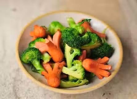 食材:香腸1根、西蘭花1棵、色拉油、食鹽適量、香油少許、澱粉適量。