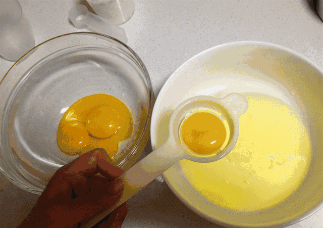 3. 將打發的蛋白霜分三次加入蛋黃中進行和勻,用刮刀進行上下的切拌,不能轉圈;