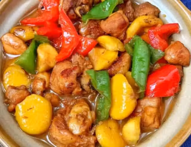 (1)板栗去皮,青紅椒洗凈去蒂切塊,雞肉洗凈切塊浸泡片刻,生薑切片,小蔥切圈。