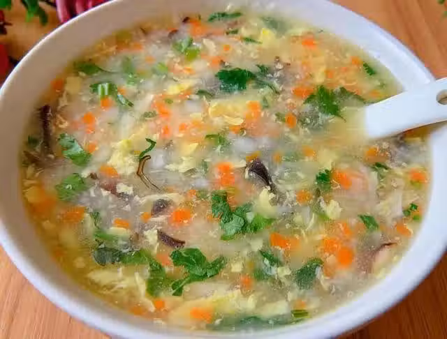 (4)最後淋入蛋液,加入適量的香菜碎、胡椒粉、雞精調味即可出鍋,多種蔬菜混合搭配營養又健康,孩子喜歡喝!