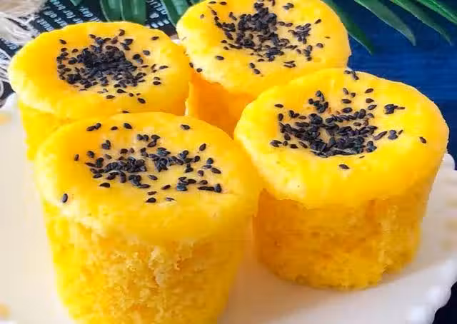 (3)發酵好的玉米面糊,倒入烘培紙杯中八分滿,再撒上少許黑芝麻點綴。