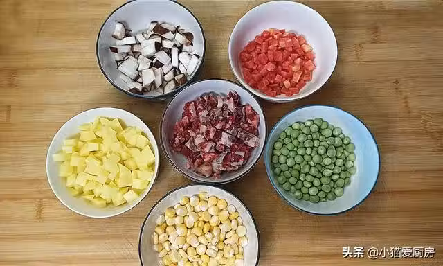 【步驟三】:大米和調料攪拌均勻後依次放入臘腸、青豌豆、玉米粒、香菇和土豆,中間再放入一個清洗乾淨的西紅柿。